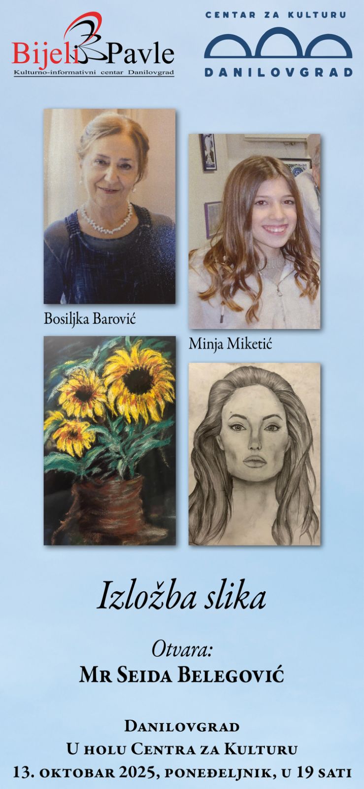 📍KIC ,,Bijeli Pavle” u saradnji sa Centrom za kulturu Danilovgrad organizuje izložbu slika Bosiljke Barović i Minje Miketić.