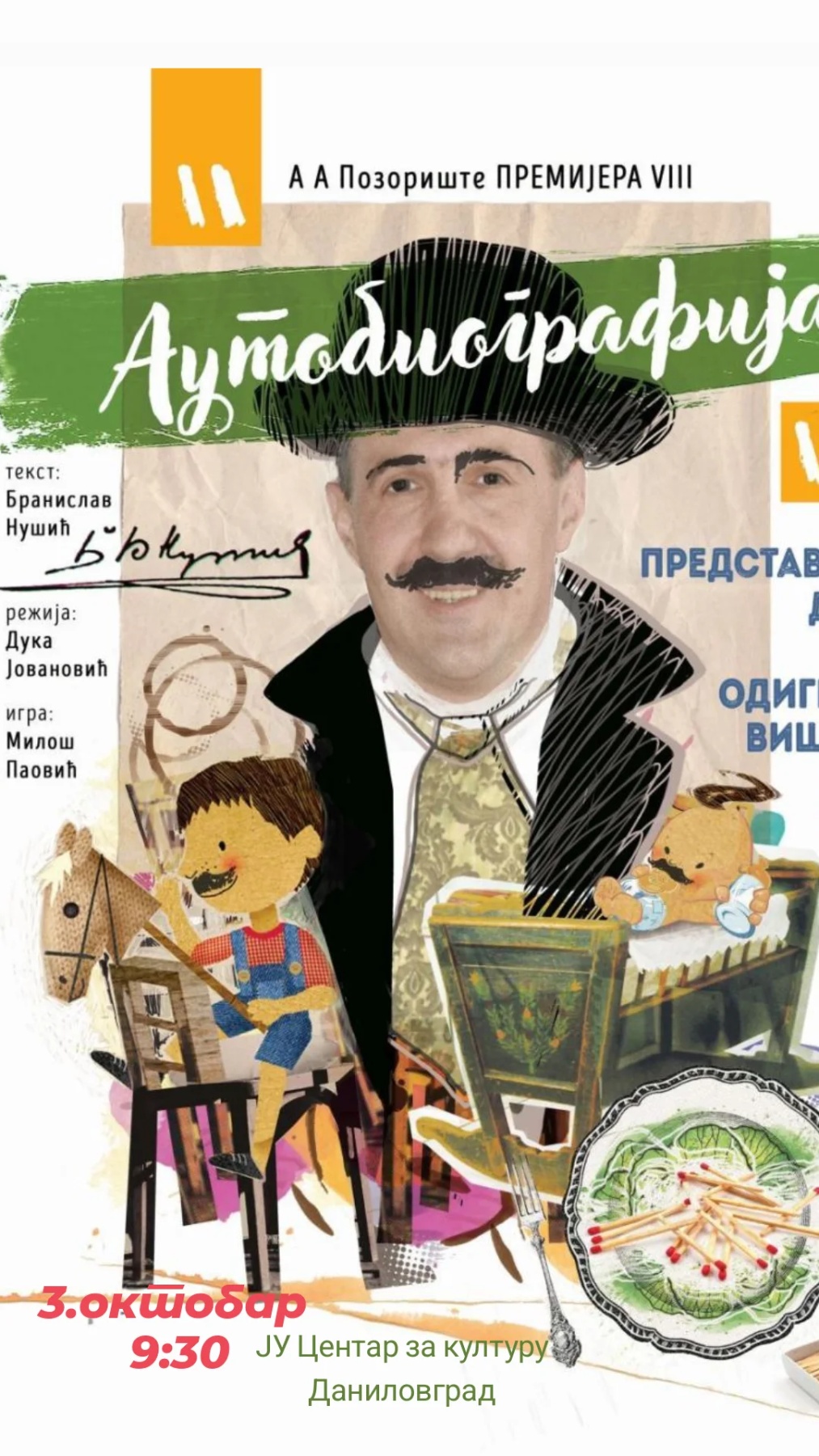pozorišna monodrama za djecu „Autobiografija“ po tekstu Branislava Nušića, biće izvedena na sceni Centra za kulturu u Danilovgradu.
