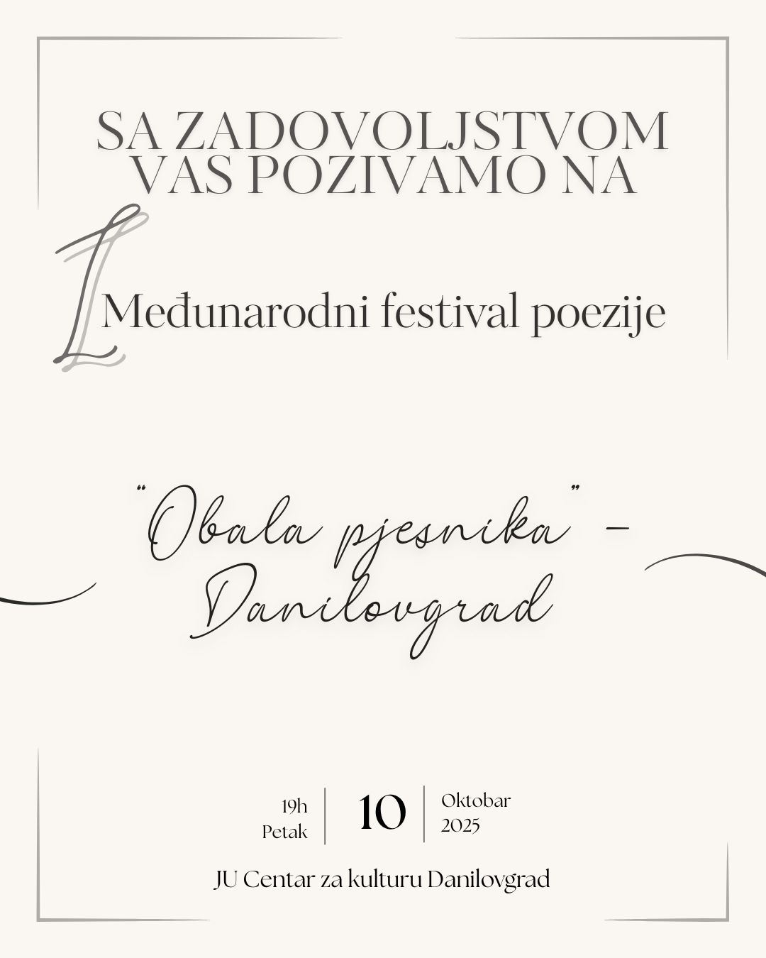 U petak, 10. oktobra sa početkom u 19.00 časova, u danilovgradskom Centru za kulturu biće održan prvi Međunarodni festival poezije – “Obala pjesnika”.